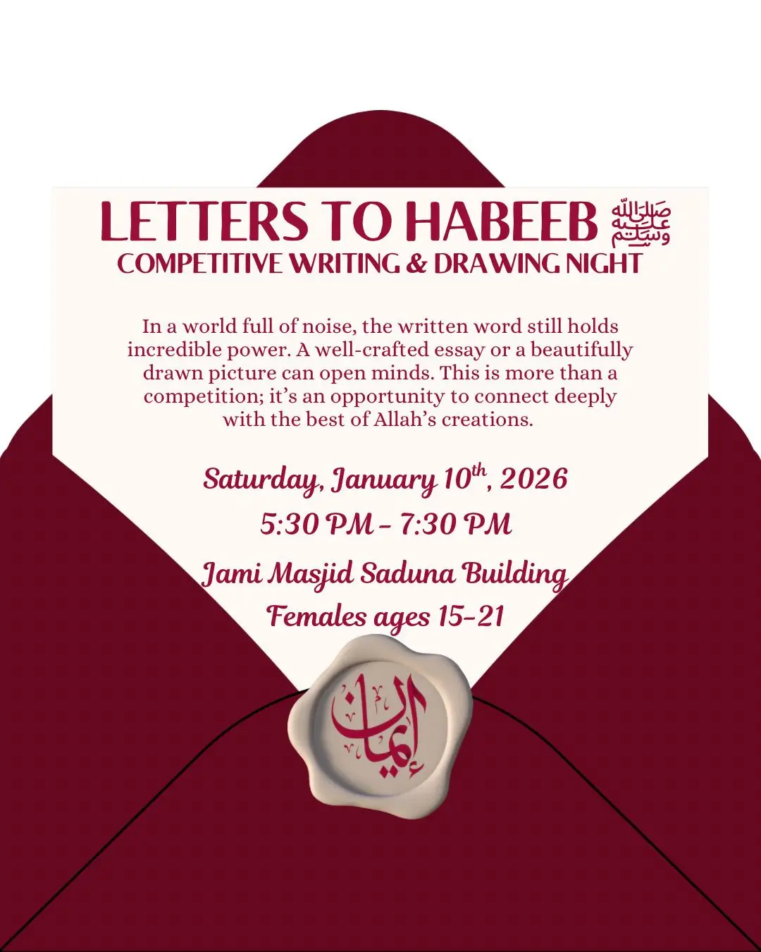 Letters to HabeebIt’s time….. Join Project Iman this Saturday evening for a friendly writing/drawing competition! Prompt: Write a letter to the Habib ﷺ. It can be a poem, a picture, or words from the heart. This competition is designed as an opportunity to connect with our Prophet ﷺ, the best creation of Allah سبحانه و تعالى!