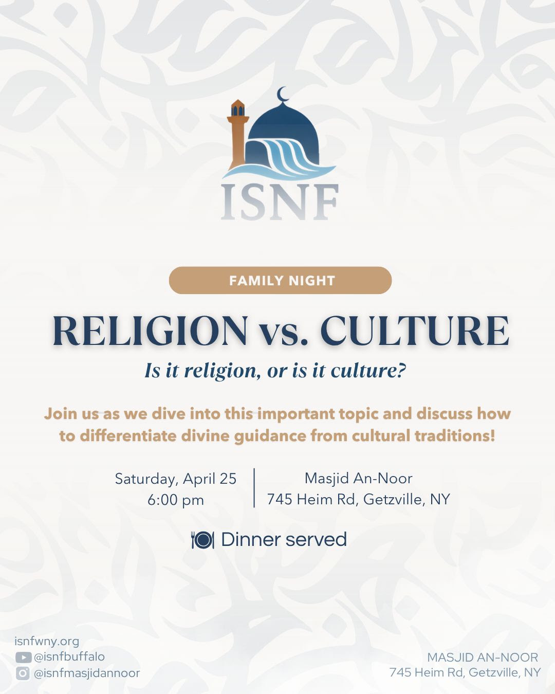 Family NightRELIGION vs. CULTURE Is it religion, or is it culture? Join us as we dive into this important topic and discuss how to differentiate divine guidance from cultural traditions! Saturday, April 25 Masjid An-Noor 6:00 pm 745 Heim Rd, Getzville, NY Dinner served — |