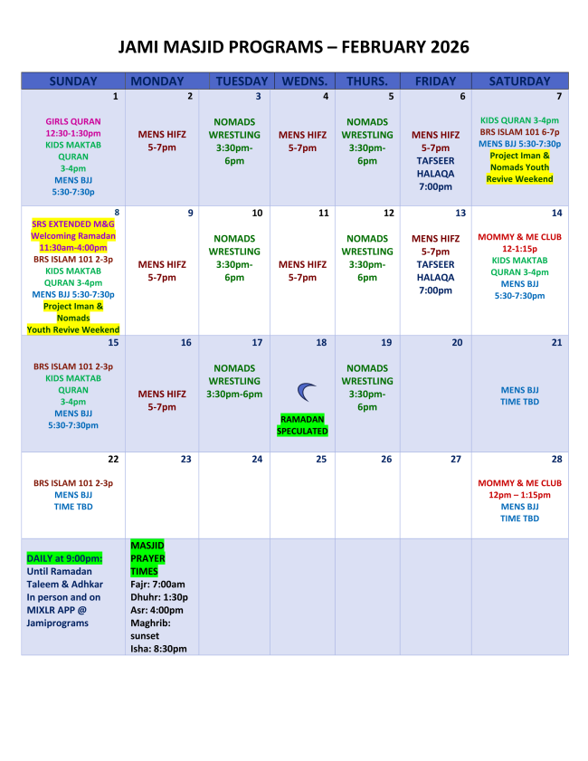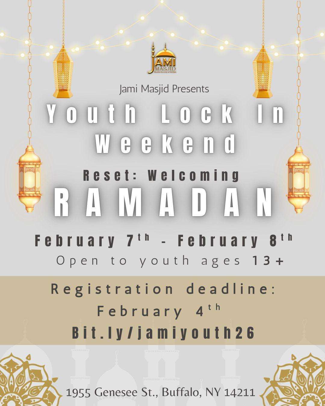 Lock-In and Reset Pre-Ramadan Youth WeekendComing up Sat Feb 7th and Sun Feb 8th: Lock-In and Reset Pre-Ramadan Youth Weekend Games, Trips, Activities, Nasheed, Good Food, Special Guest Speakers & More! Boys & Girls Ages 13-25 Registration deadline Feb 4th or until space is filled up! Space is limited. Register today before it's too late! —