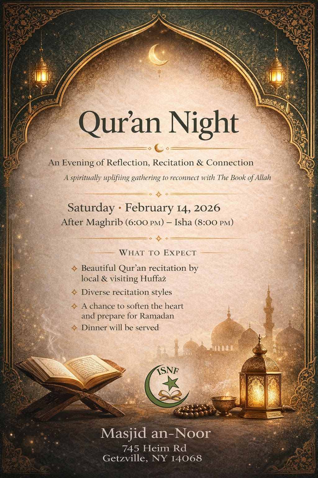 What to Expect: Beautiful Qur'an recitation by local & visiting Huffaz Diverse recitation styles A chance to soften the heart and prepare for Ramadan Dinner will be served — |